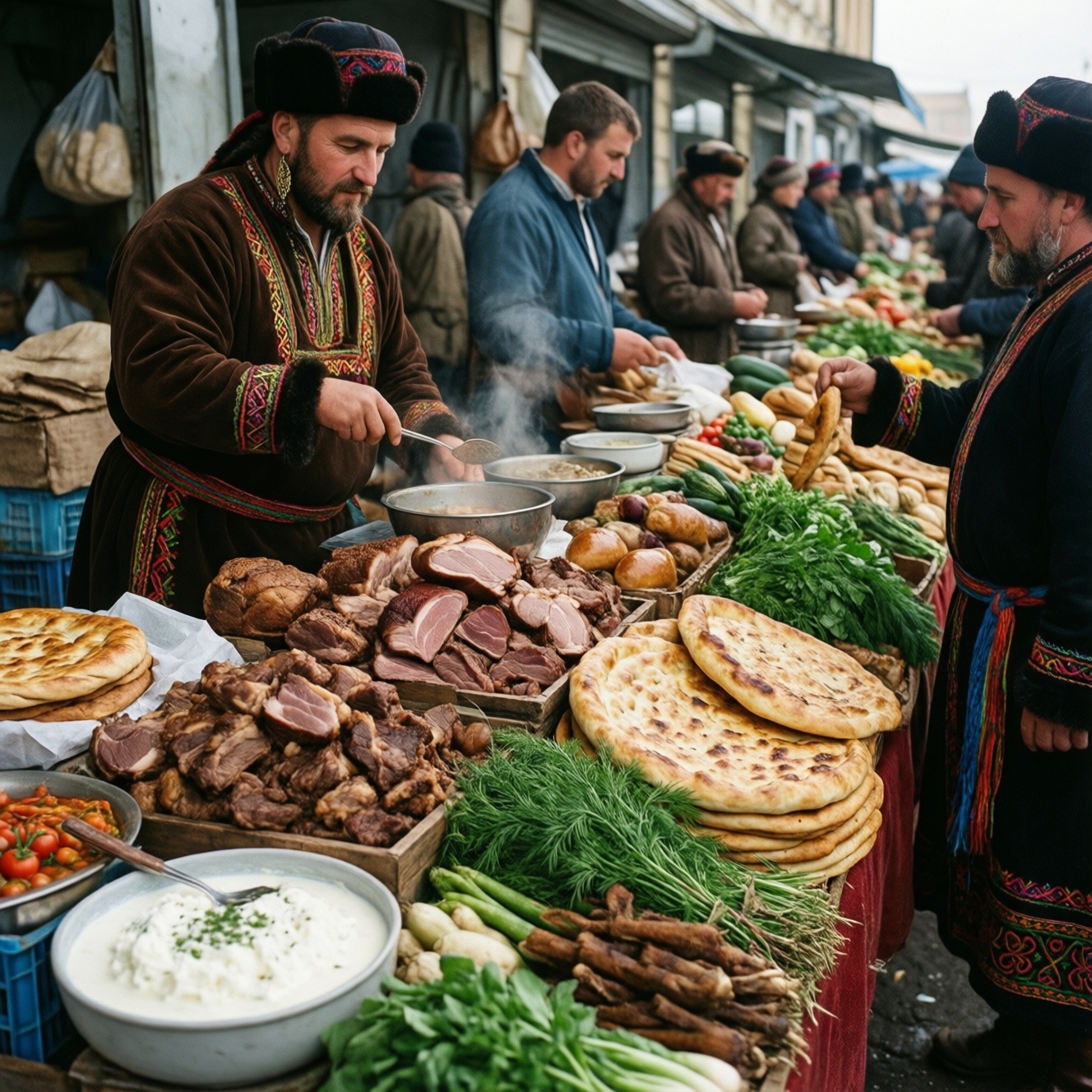 - Тесто в разных видах: лепёшки, пироги, хинкал/похожая подача (варианты зависят от места).